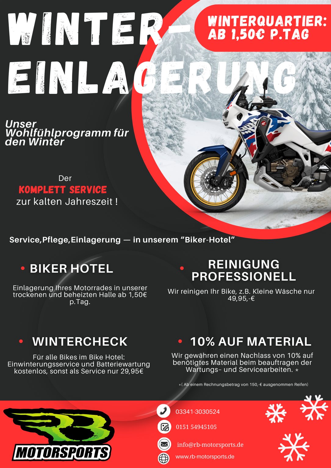 – **Wintercheck**: Kostenloser Winterservice und Batterieüberprüfung für alle Bikes im Biker Hotel. Andernfalls beträgt die Servicegebühr nur 29,95€.